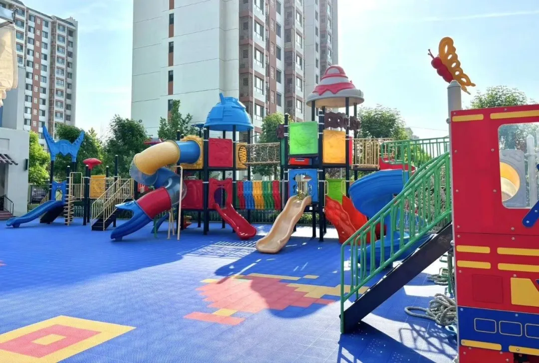 户外设有大型滑梯、蹦蹦床、酷跑、各种车类、攀爬区、沙水区、安吉游戏材料等适合各个年龄段幼儿玩耍、锻炼的体育器械设施设备,均放置在自然草坪及悬浮地板之上,在保证幼儿安全的基础上满足了幼儿全面健康和谐发展的需要,给孩子们精心创设了一个符合其发展需求的环境。